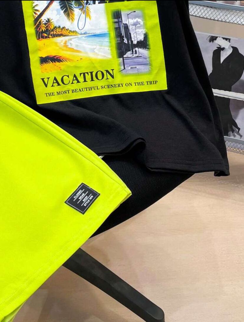 セットアップ 140 男の子 半袖Tシャツ 胸プリント ジャージ 半ズボン ロゴ 黒 蛍光グリーン