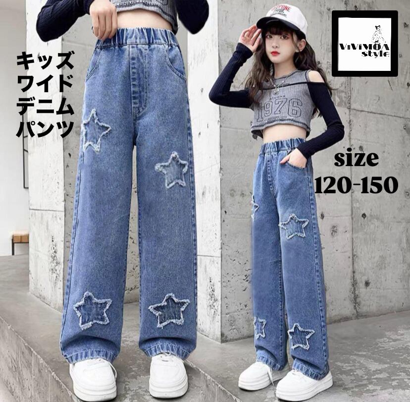 星デニムパンツ ワイドパンツ ブルー キッズ ジーパン ジーンズ