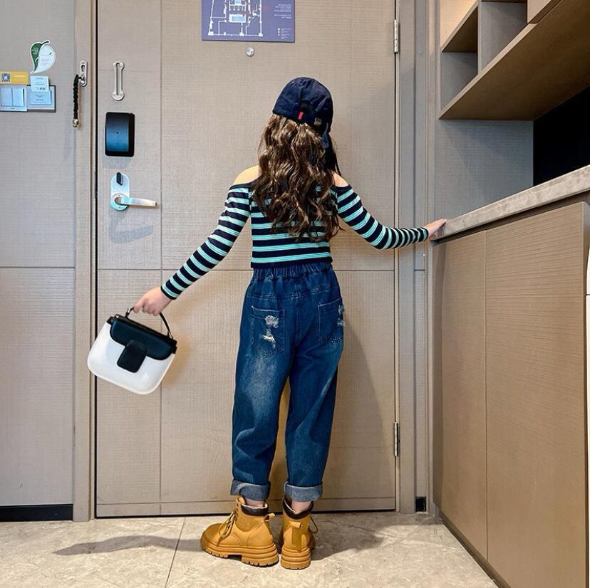 ロンT デニム セットアップ 2点売り 女の子 ボーダートップス オフショルダー デニムパンツ